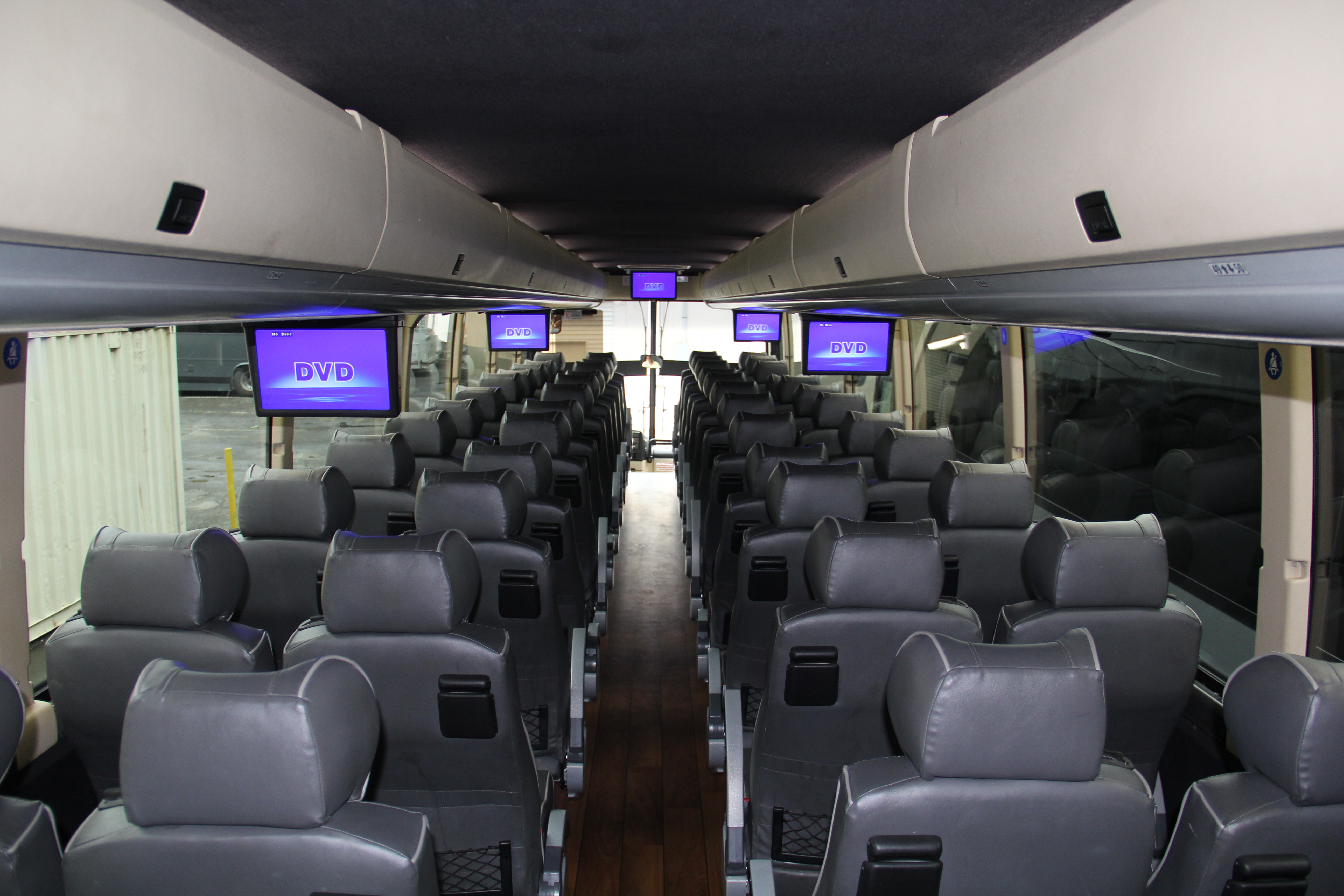 Our late model 56 passenger Volvo Prevost are ideal vehicle for a large groups and/or long distance travel. These buses equipped with multiple flat screen monitors, CD/DVD/MP3 player, power ports to charge electronic devices, WiFi, bathroom and abundant luggage storage space. All of our Prevost have 100% air suspension which allows for the smoothest ride possible.