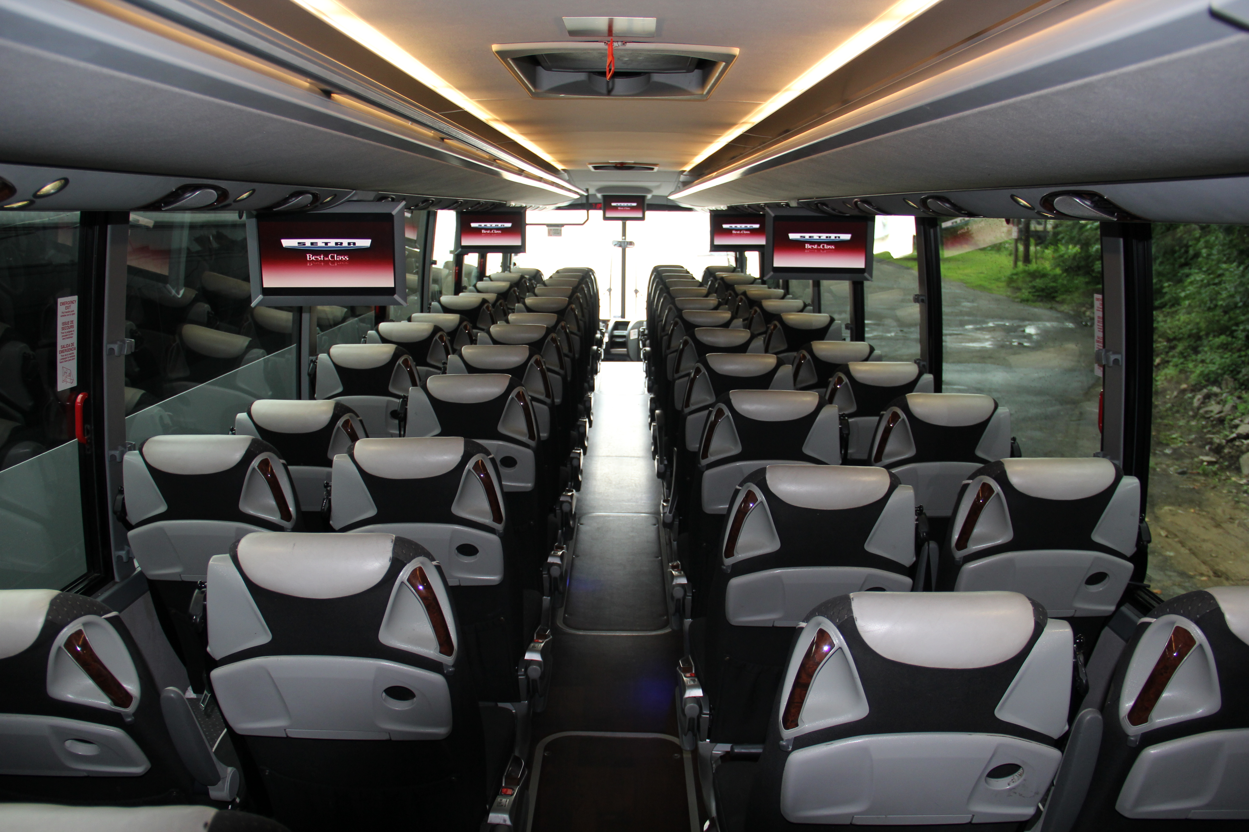 Our late model 56 passenger Mercedes Setras are ideal vehicle for a large groups and/or long distance travel. These buses equipped with multiple flat screen monitors, CD/DVD/MP3 player, power ports to charge electronic devices, WiFi, bathroom and abundant luggage storage space. All of our Setras have 100% air suspension which allows for the smoothest ride possible.