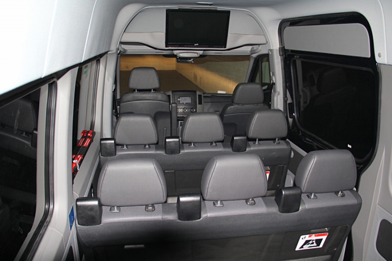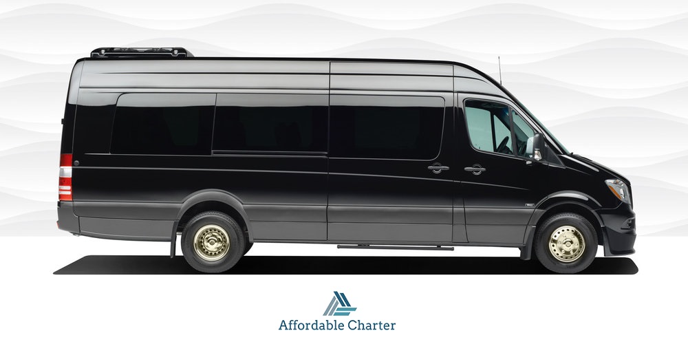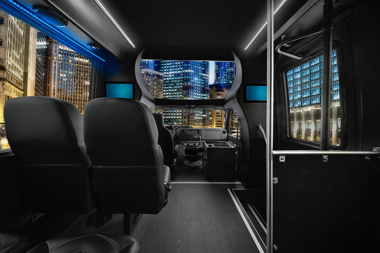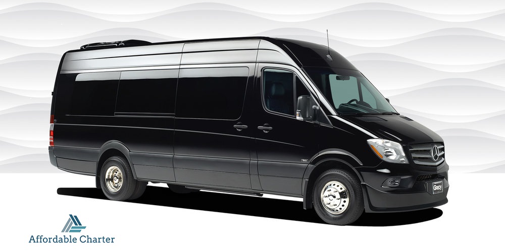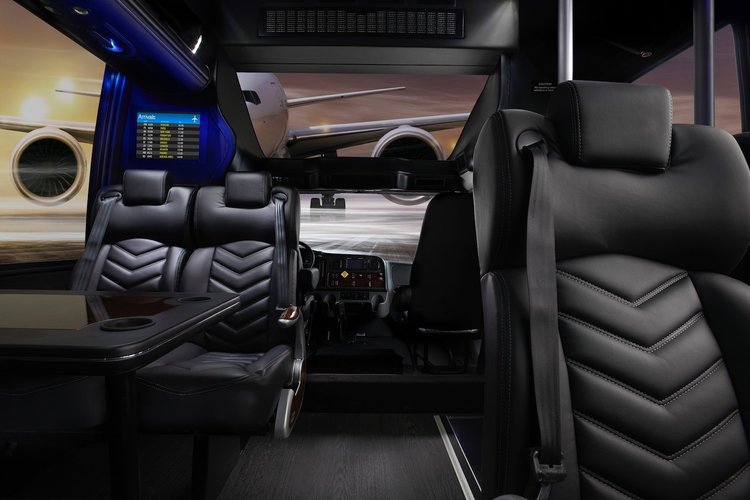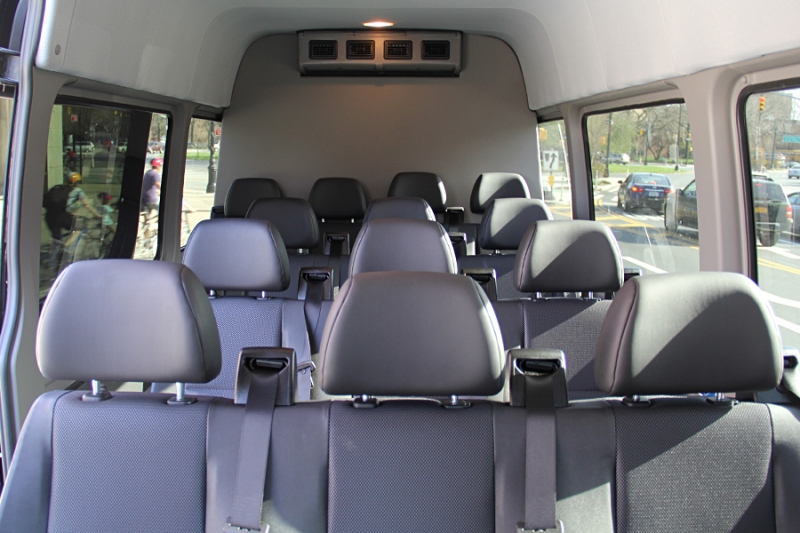 14 Passenger Mercedes Sprinters is where style and luxury meets technology. They are fully customized with comfortable black leather seats, tinted windows, PA system with microphone, LCD TV, DVD player, power ports to charge any electronic device, surround sound and WiFi.