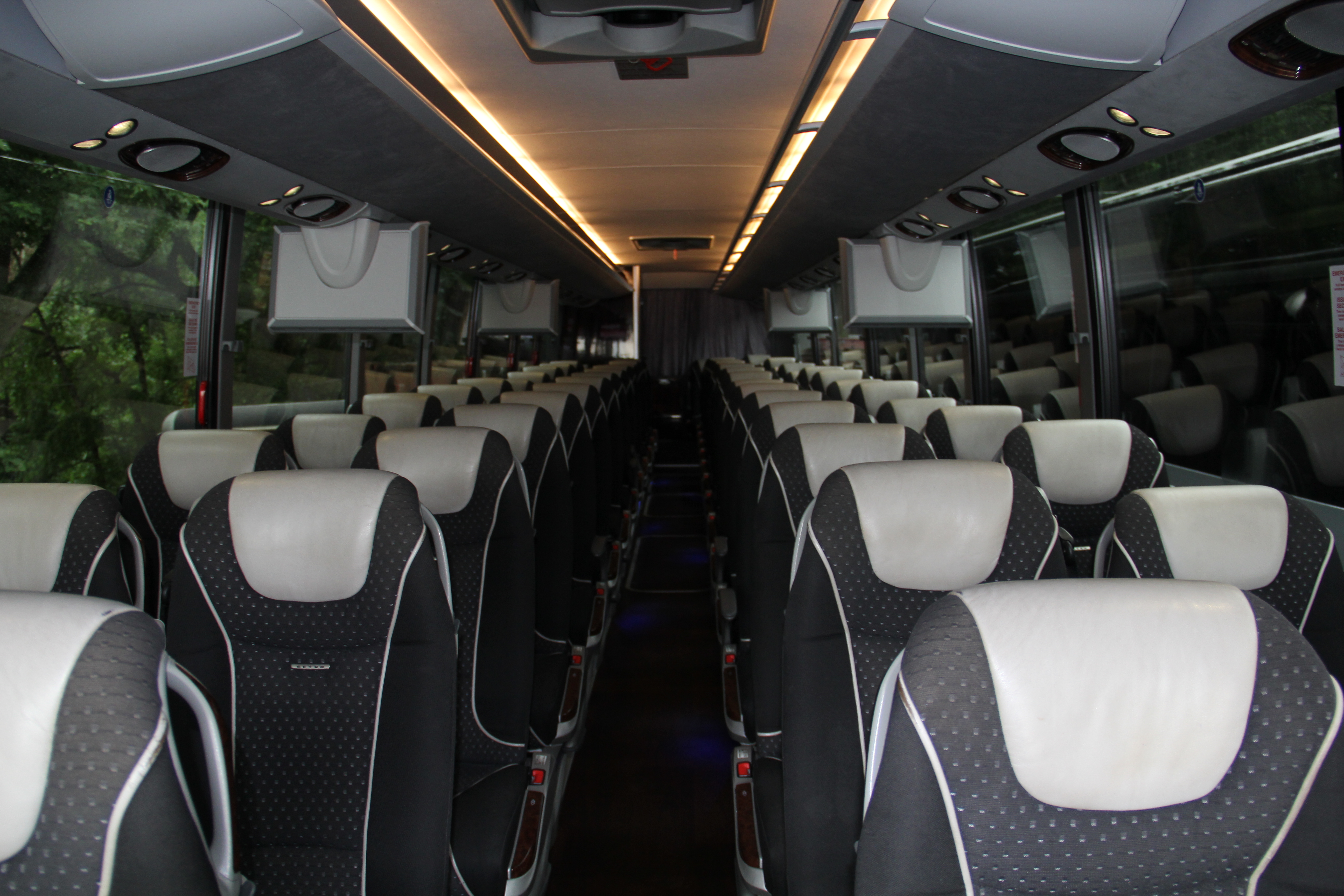 Our late model 56 passenger Mercedes Setras are ideal vehicle for a large groups and/or long distance travel. These buses equipped with multiple flat screen monitors, CD/DVD/MP3 player, power ports to charge electronic devices, WiFi, bathroom and abundant luggage storage space. All of our Setras have 100% air suspension which allows for the smoothest ride possible.